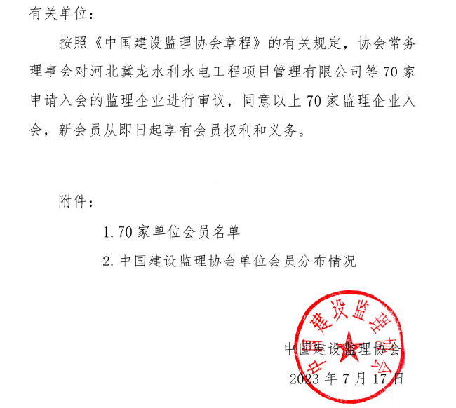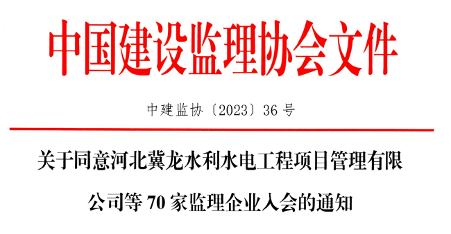 星空网页版同意河北冀龙水利水电工程项目管理有限公司等70家监理企业入会的通知