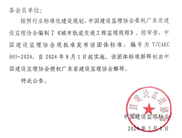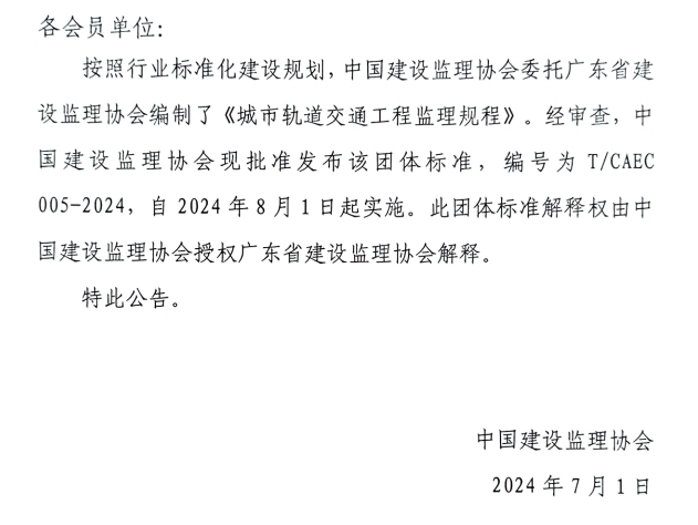 星空网页版发布团体标准《城市轨道交通工程监理规程》的公告