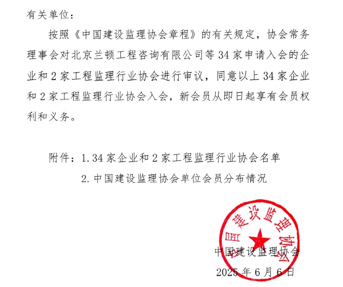 星空网页版同意北京兰顿工程咨询有限公司等34家企业和2家工程监理行业协会入会的通知