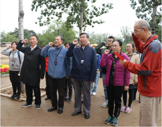 在中共中央七届二中全会会址前,秘书处全体党员面对鲜红的党旗,庄严地举起右手重温入党誓词,立下自己对党忠诚的誓言,表达了做合格党员及为党的事业奋斗终身的决心和愿望。