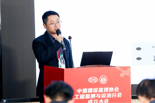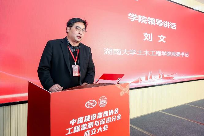 湖南大学土木工程学院党委书记刘文讲话,首先祝贺分会成立。他强调当前建筑行业处于从增量向存量转型的关键时期,应促进高校科研成果与企业实际需求的深度对接,共同推动工程监测与诊治技术的创新发展与应用推广。学院将继续与各界同仁携手共进,为我国工程建设事业贡献更多的智慧与力量。