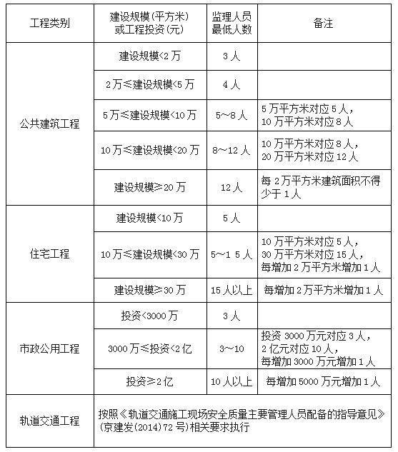 第二十二条 新建公共建筑和市政公用工程,项目监理机构人员配置数量最低不少于3人。根据工程规模或工程投资额的增加,应相应增加项目监理机构人员配备。新建公共建筑、住宅工程和市政公用工程,项目监理机构人员最低配备参考标准见附件。