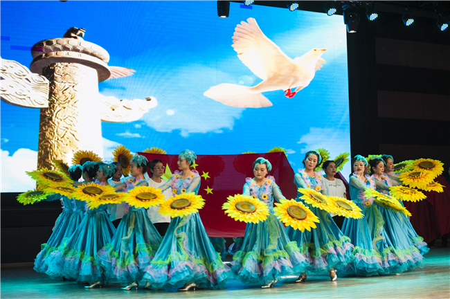 最后,全体人员起立齐声高唱“歌唱祖国”,庆祝中华人民共和国成立70周年文艺汇演在欢乐祥和的气氛中结束,取得圆满成功。