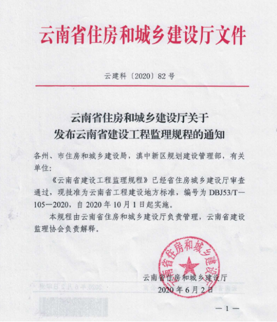 6月2日,《云南省住房和城乡建设厅星空网页版发布云南省建设工程监理规程的通知》(云建科【2020】82号)发布。通知明确《云南省建设工程监理规程》已经省住房城乡建设厅审查通过,批准为云南省工程建设地方标准,编号为DBJ53/T-105-2020,自2020年10月1日起实施。