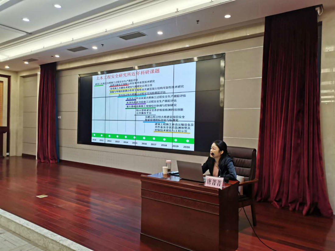 图为华中科技大学土木与水利工程学院副教授、硕士生导师唐菁菁博士在武汉地区公益讲座上主讲《施工起重机械安全监理实务》照