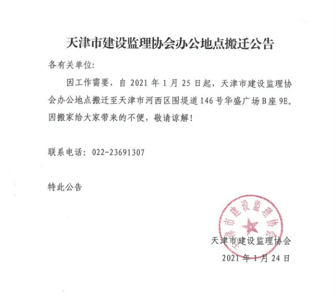 天津市建设监理协会办公地点搬迁公告
