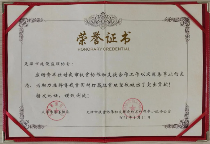 天津市扶贫协作和支援合作工作领导小组办公室为我会颁发了荣誉证书,感谢协会对我市扶贫协作和支援合作工作以及慈善事业的支持,为助力挂牌督战贫困村打赢脱贫攻坚战做出了突出贡献!