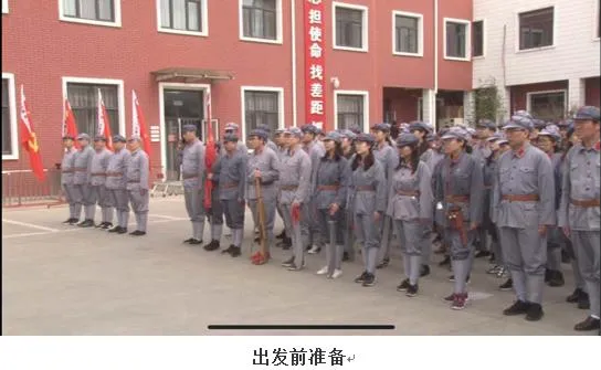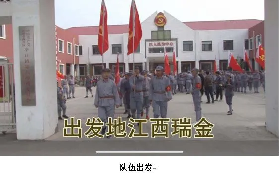 早上9点,全员集结,在清晨的阳光下,五星红旗冉冉升起,全员面对党旗重温入党誓词,随后“红一方面军”接过“军首长”授予的队旗,“重走长征路”热烈开场。