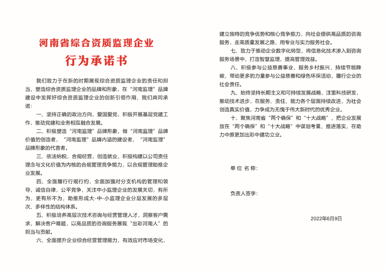 会上,综合资质监理企业负责人就展现综合资质监理企业的责任与担当,维护“河南监理”品牌声誉与形象,从政治方向、品牌建设、合规运营、管理能力、诚信自律、人才建设、数字转型、社会责任、智慧监理、服务大局十个方面向社会做出行为承诺,签署了《综合资质监理企业行为承诺书》。
