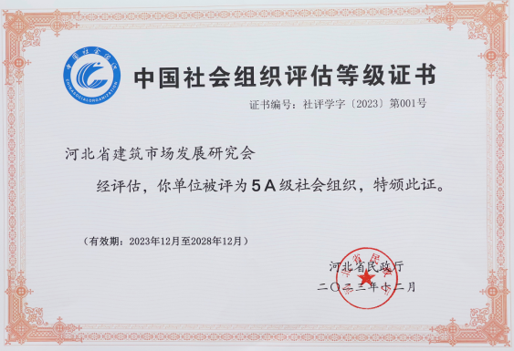 2023年12月29日,河北省民政厅公布2023年度社会组织评估等级结果,河北省建筑市场发展研究会获评为5A级社会组织。