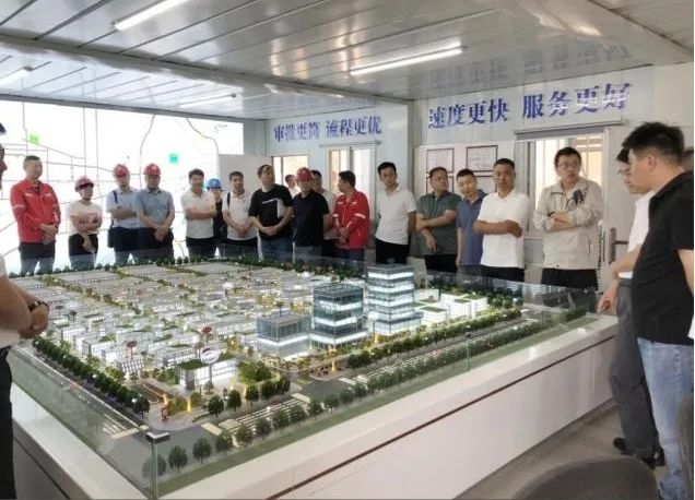 汇报后观摩人员通过项目沙盘对项目产业园区布局、项目特点进行了直观了解,并在项目部人员的引导下,进入项目现场进行实地观摩。