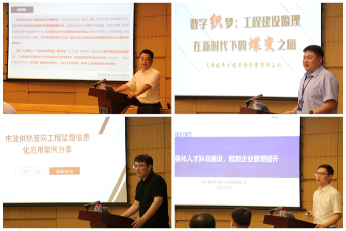 会议上半时,作为自主研发信息管理系统的企业代表——北京赛瑞斯国际工程咨询有限公司总工程师杨文波以《大型综合咨询企业信息化转型之实践与经验交流》为题、天津建华咨询数据中心总监李兴华以《数字织梦工程建设管理在新时代下的蝶变之旅》为题,分享了各自企业信息化建设发展规划、进程和现状及企业转型经验与心得,对现有信息化、数智化平台落地成果进行展示,畅享监理未来发展方向。作为委托公司定制开发信息管理系统的企业代表天津市津能工程管理有限公司副总工程师邸超以《市政管网工程监理信息化应用案例分享》为题,分享了公司“工程匠心”监理系统的核心功能和应用成效。与会成员着重探讨了不同企业规模适配的信息管理系统建设模式、信息管理系统在监理行业的应用场景与实践经验和数智化建设助力企业提升服务质量、增强市场竞争力的有效路径。