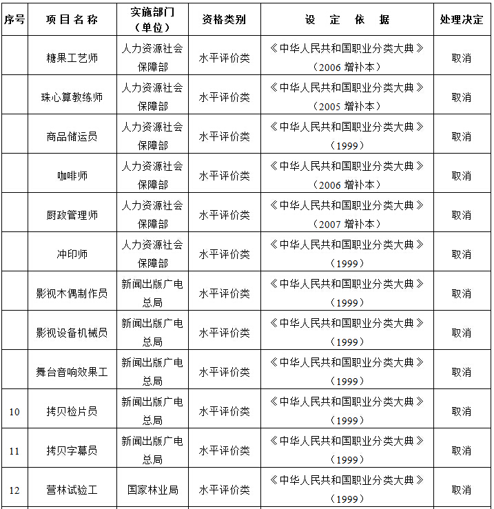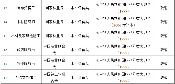 二、取消的技能人员职业资格许可和认定事项(共计18项,均为水平评价类)