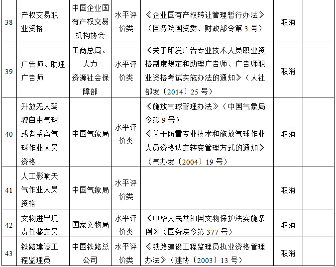 一、取消的专业技术人员职业资格许可和认定事项(共计43项,其中准入类5项,水平评价类38项)